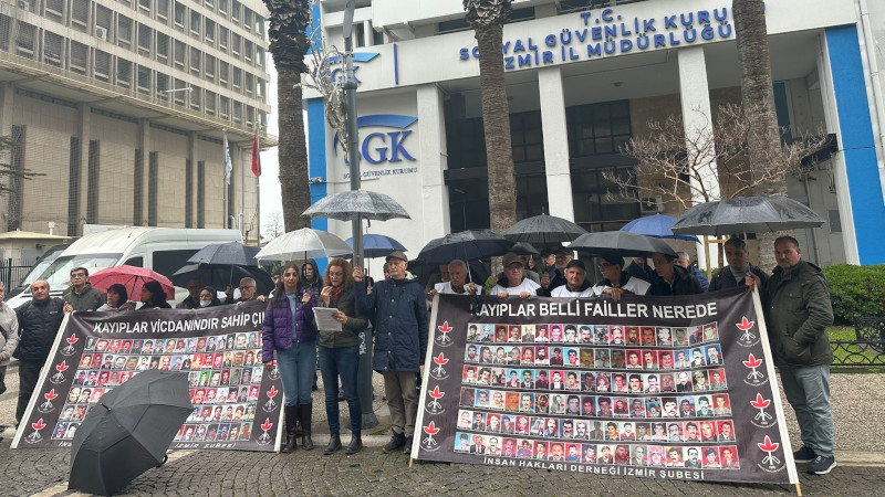 İHD İzmir Şubesi, gözaltında kaybedilenlerin akıbetini sormak için iki haftada bir düzenledikleri oturma eylemini Konak eski Sümerbank önünde devam ettirdi. Açıklamada, "Kayıplar belli failler nerede" ve "Kayıplar vicdanındır sahip çık" pankartları açıldı.