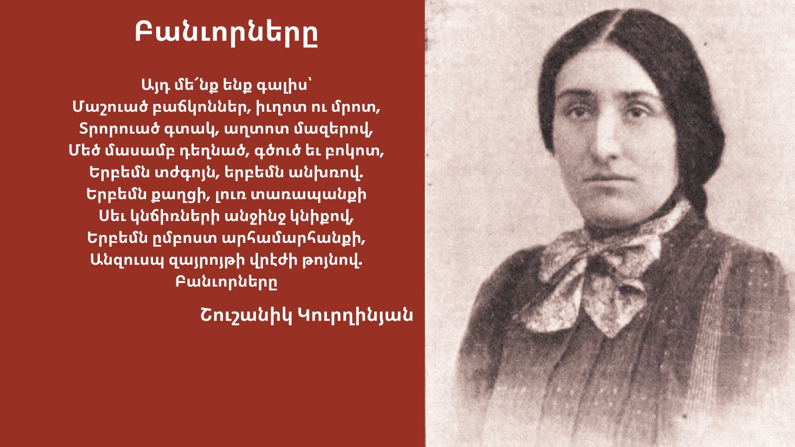 Nor Zartonk, 21 Şubat Dünya Anadili Günü'nde Şuşanik Gurğinyan'ın 1907 tarihli "Panvornerı" İşçiler şiirinin Ermenicesini bizimle paylaştı. Ayrıca, şiirin tamamını ETHA için Türkçe'ye çevirdi. Tüm diller özgür olana kadar dayanışmayla!