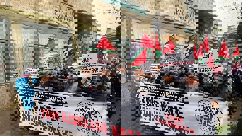 Türk devletinin emperyalist-siyonistlerle işbirliğini gizlemek için yalnızca "söylem" düzeyinde çıkışlar yaptığını belirten Bozkurt, şöyle devam etti: "Soykırımcılarla tüm ilişkileri kesin ve siyonist rejime tam bir ambargo ilan edin. İşte burada önünden sesleniyoruz, soykırımcıları temsil eden bu konsolosluğu kapatın ve bu rejimi tanımadığınızı ilan edin.
