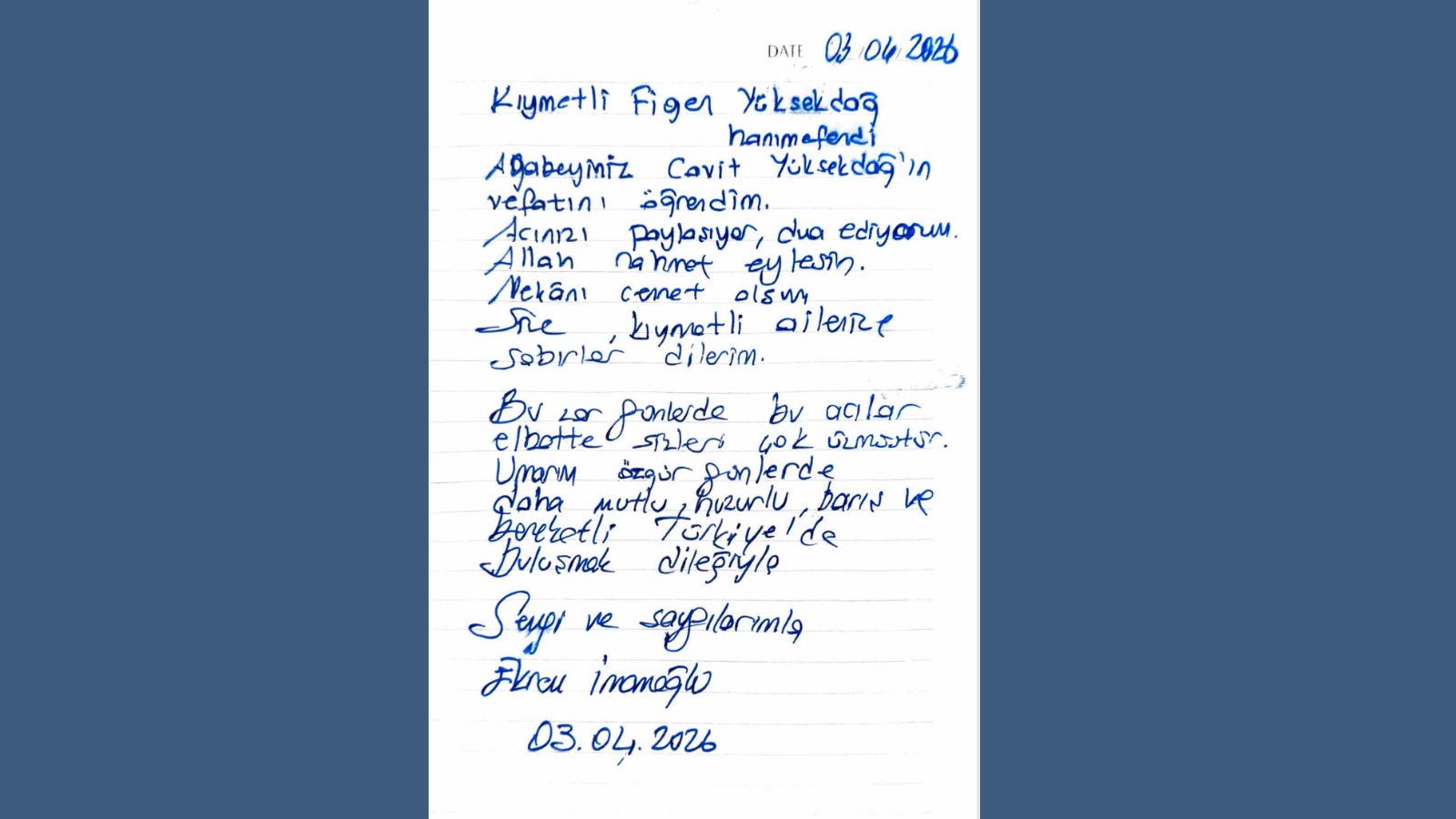 Son bir yıldır Silivri Hapishanesi'nde tutulan İstanbul Büyükşehir Belediyesi Başkanı Ekrem İmamoğlu, ağabeyi Cavit Yüksekdağ'ı kaybeden HDP eski Eş Genel Başkanı Figen Yüksekdağ'a taziye mesajı yolladı.