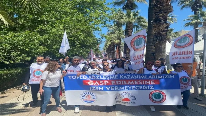 İzmir'de Bayraklı, Karşıyaka, Narlıdere ve Buca belediyelerinde çalışan memurlar, Toplu İş Sözleşmesi (TİS) kapsamındaki haklarının ihlal edilmesine karşı yarım günlük iş bırakma eylemi gerçekleştirdi. Çalıştıkları belediyelerin önünde açıklama yapan memurlar, daha sonra Basmane Kültürpark önünden CHP İzmir İl Başkanlığı'na yürüyüş düzenledi. "Toplu iş sözleşmesi kazanımlarımızın gasp edilmesine izin vermeyeceğiz" pankartı açılan yürüyüşte, "Birleşe birleşe kazanacağız", "Sözleşme hakkımız gasp edilemez" ve "Yaşasın örgütlü mücadelemiz" sloganları atıldı.