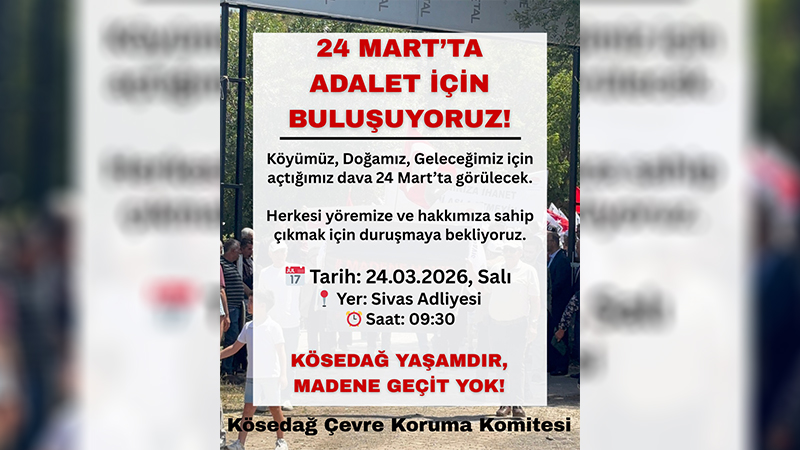 Komite, 24 Mart 2026 Salı günü saat 09.30'da Sivas Adliyesi'nde görülecek duruşma için demokratik kamuoyunu, çevre savunucularını ve tüm duyarlı kesimleri dayanışmaya davet etti.