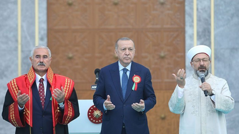 Erdoğan'ın konuşması sırasında salondan "Laiklik kalksın" sloganları yükseldi.