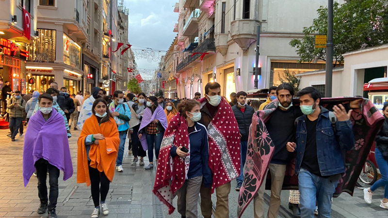 Yurtsuzlar battaniyelerle İstiklal'de yürüdü