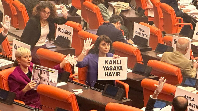 Hayvan katliamı yasa tasarısı görüşmeleri dövizli protestoyla başladı