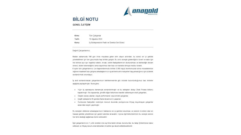 Anagold Madencilik 3 bin işçiyi işten çıkarıyor: Maaşlarını ödeyemiyormuş ETHA 19 Ağustos 2024 Pazartesi