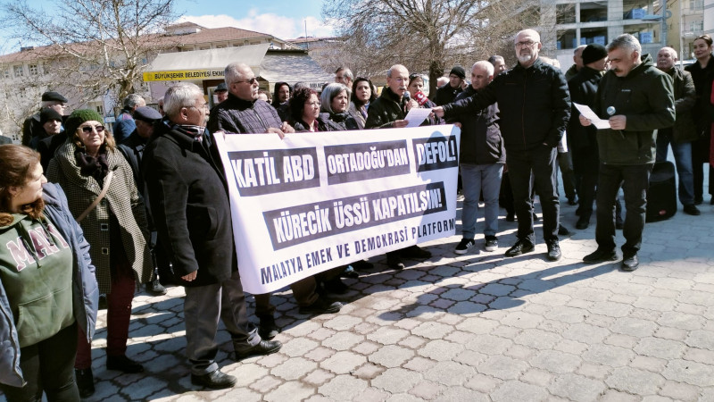 Malatya Emek ve Demokrasi Platformu, ABD ve İsrail'in İran'a yönelik saldırılarını protesto etmek için basın açıklaması düzenledi. Açıklamada "Savaşa hayır", "Katil ABD Ortadoğu'dan defol" sloganları atılırken basın metnini Şerif Demirel okudu.